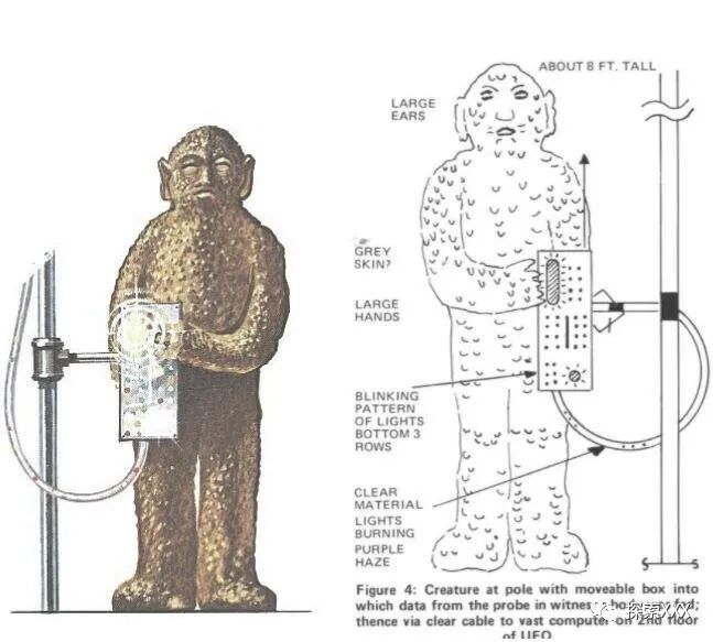 在这个危险的房间中间,有一根从地板到天花板的柱子(这个细节在其他此类报告中也出现过)。在这根柱子上,有一个奇怪的盒子,向他发出了一道“强烈的光柱”。一个奇怪而且样子很凶恶的生物站在盒子附近,似乎在以某种方式操纵着它。当斯科特看着那个生物和周围的雾气时,他注意到这些雾状物质似乎在渗入这个生物的皮肤。