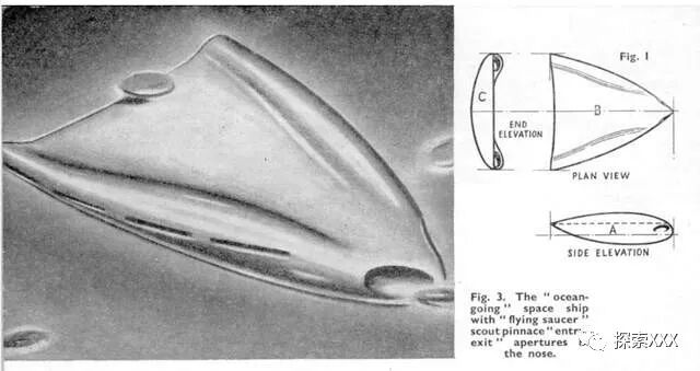 在图1中,我们可以看到一个特殊形状的物体的三视图。A代表母船俯视图,B是它的前视图,而C的电话听筒形态是它的侧视图。根据三个视图,我们可以还原这个物体的实际形态。霍华德说它看起来就像一艘远洋客轮那么大。如果它需要在地球上以海洋为主要活动区域,那么这种形状的确非常适合海洋环境。