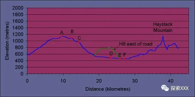 在苏和莎拉到达了“E”点后,她们惊奇地看到这个东西开始向印第安纳河对岸12公里外的干草堆山后面移动!现在面前是山,意识到物体的巨大性几乎令人难以置信。到现在为止,她们认为它最远就在印第安河上,但现在她们意识到它要远得多。随着它继续下降到干草堆山后面,它的倾斜角度也增加了。