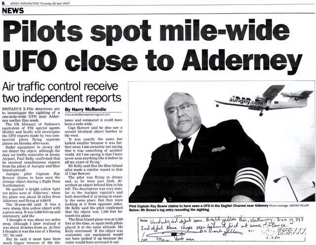 2007年4月23日,一位名叫雷·鲍耶的英国航空公司飞行员在英吉利海峡奥尔德尼岛上空遇到了不明飞行物。这一事件后来被称为奥尔德尼UFO目击事件。