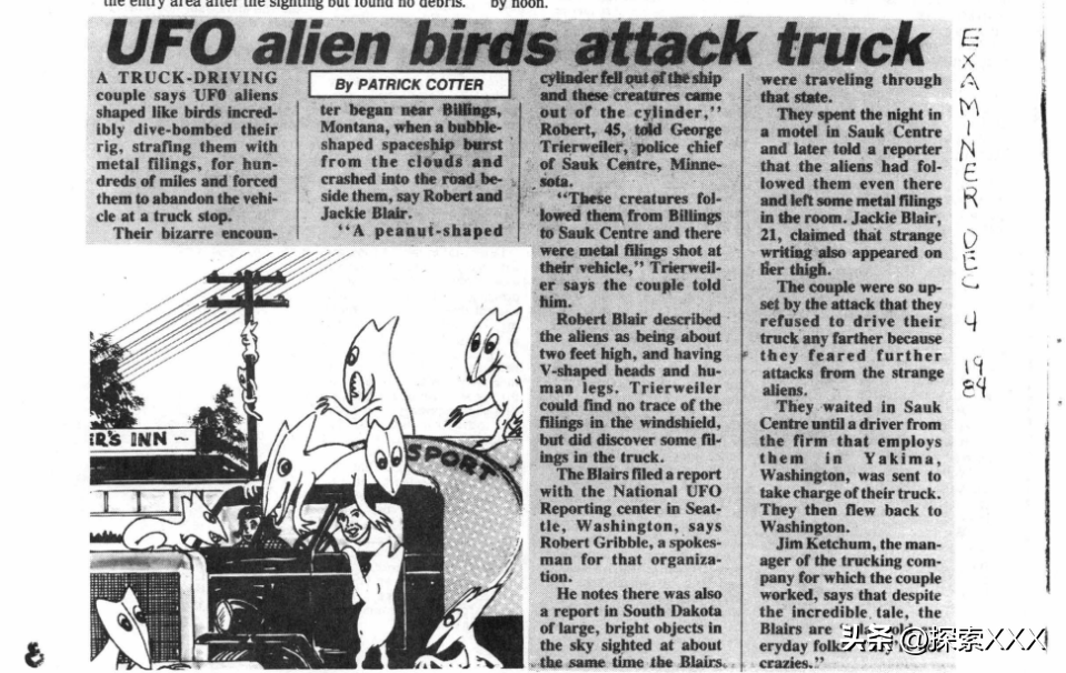 1984年12月4日的Examiner上,报道了这样一则趣闻:一辆卡车被一群像鸟一样的外星生物攻击。以下是详细报道。