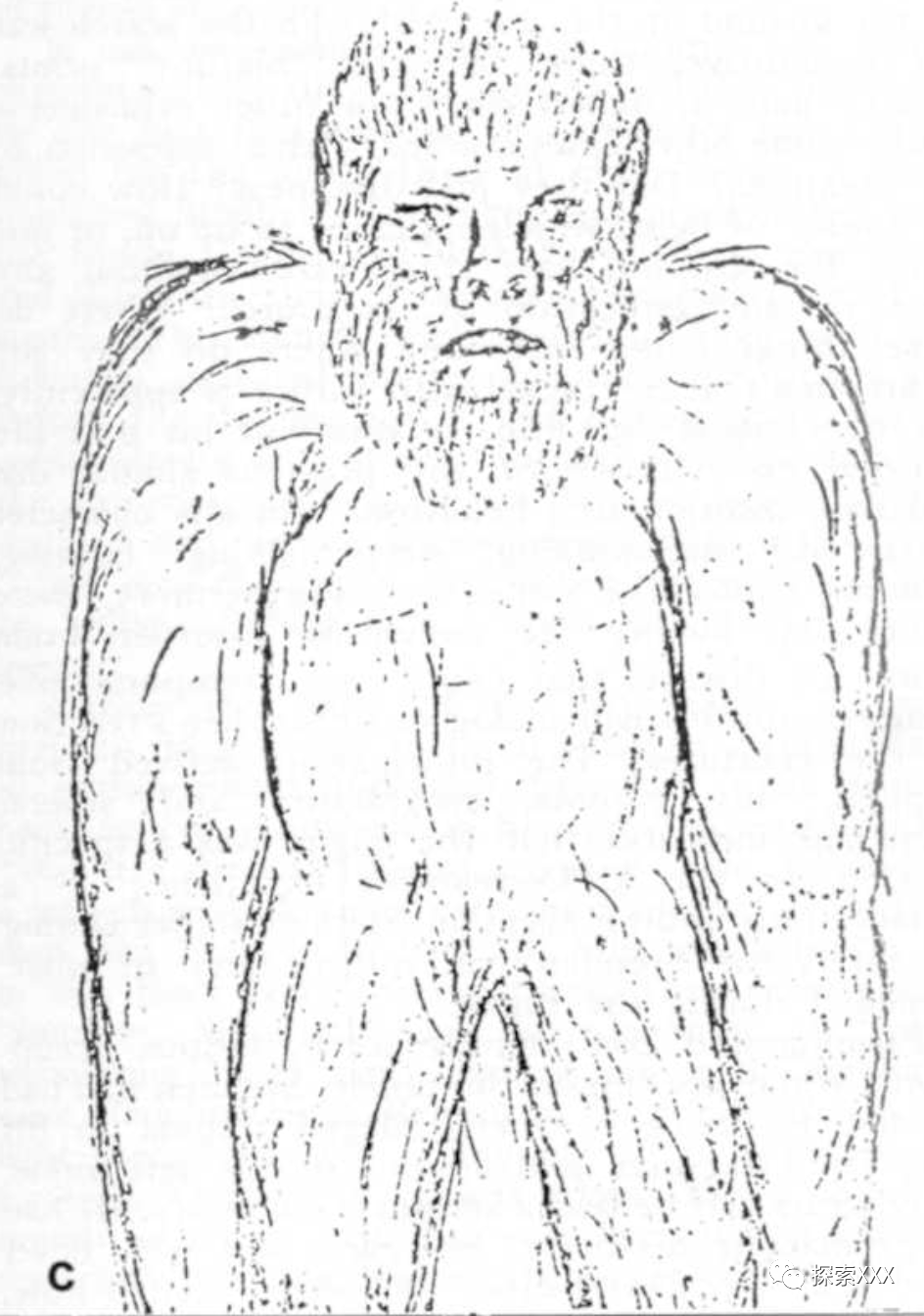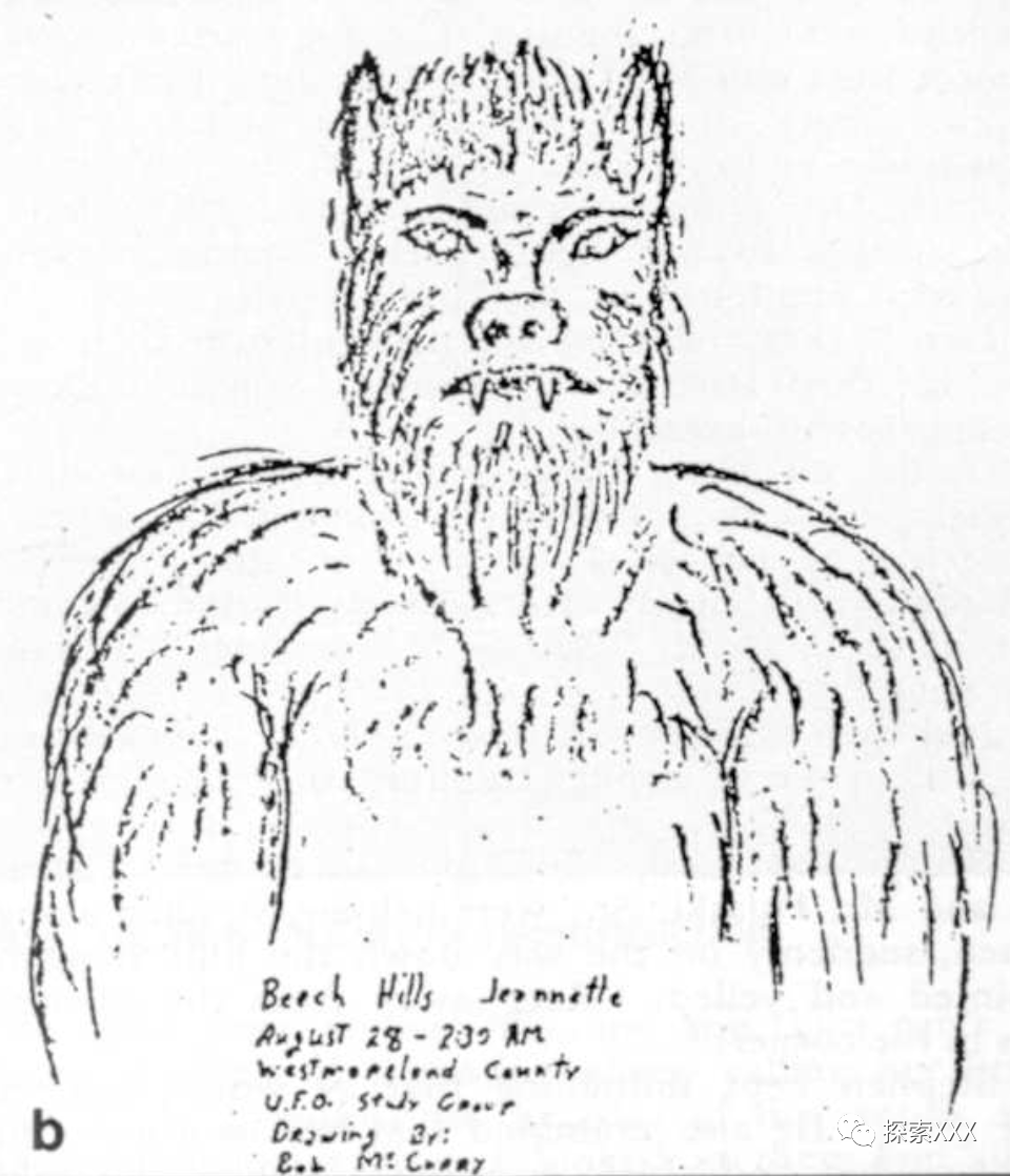 这个生物的外貌相似,其中一个大约有7英尺高(栅栏柱高度为6英尺),另一个则略高一英尺。更大的生物的左手似乎在扶着栅栏柱,并沿着栅栏柱移动。这两种生物都长满了深灰色的长毛,眼睛是黄绿色的。他们的手臂很长,几乎垂在地上。较小的生物似乎迈着大步,好像在努力跟上那个较大的生物。两个生物发出了呜呜声,几乎就像婴儿的哭声,似乎是在互相抱怨。现场存在强烈的气味,有点像燃烧的橡胶发出的气味。