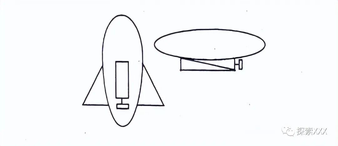报道还称,船体下方有一个盒子,但里面没有人。该物体完全是黑色的。一名男孩说,他看到螺旋桨反转,船只突然急转。7月31日的报纸转载了这六幅图画。综合这些图的信息可以得到上图所示的飞艇草图。