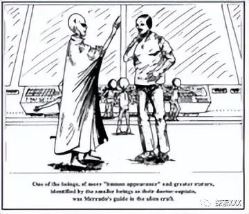 小个子生物向梅尔卡多介绍了一个身材更高的生物,大约1.75米高,看起来更像人类。它穿着白袍。这个高个子解释说,他们对梅尔卡多没有伤害,只是想展示和告诉他一些事情,以便以后可以与其他人联系。