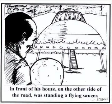 其中两个生物拉着梅尔卡多的手,沿着路走到他的房子前面。然后梅尔卡多看到,在不远处的贝尔梅哈山脉前面停着有一架飞碟!这艘飞船依靠从底部垂下来的三条金属腿站立,外表是圆形,顶部有一个圆顶,有窗户,边缘周围有许多彩色的灯光。