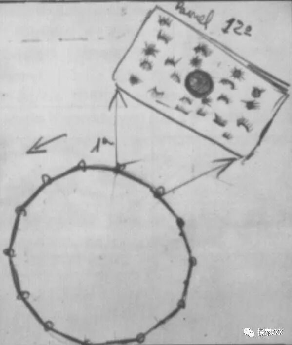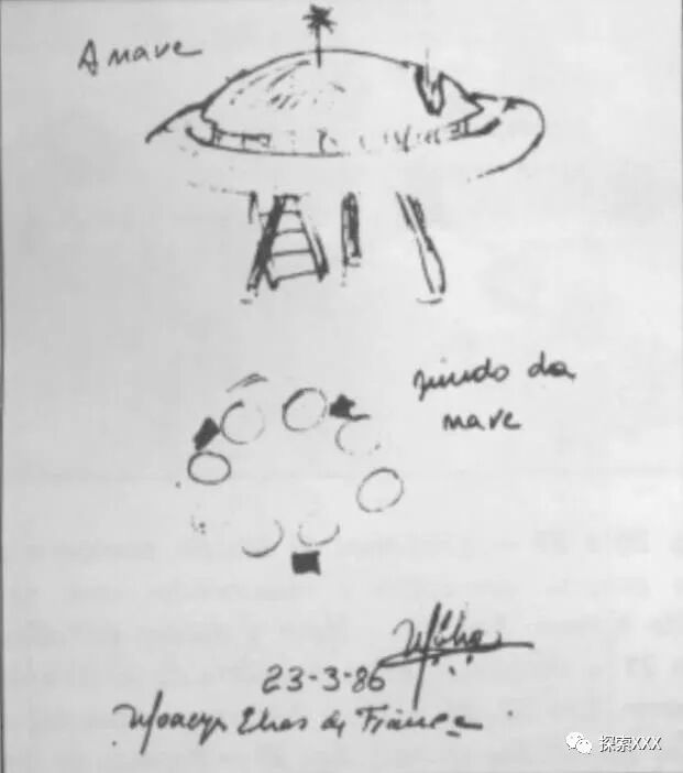 随后,在那个巨人的示意下,莫阿西尔参观了飞船的下部和外部。突然,莫阿西尔发现自己站在了飞船下方,他看到了一些闪闪发光的金属圆盘。当那个巨人举起左手时,这些金属圆盘突然从飞船底部脱落,旋转向下,变成了一个四级的台阶,通向飞船的内部。这些台阶之间的距离约为60厘米,对于人类来说有点高。不过莫阿西尔还是爬了上去,身后的巨人紧随其后。
