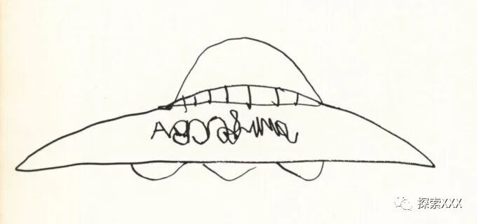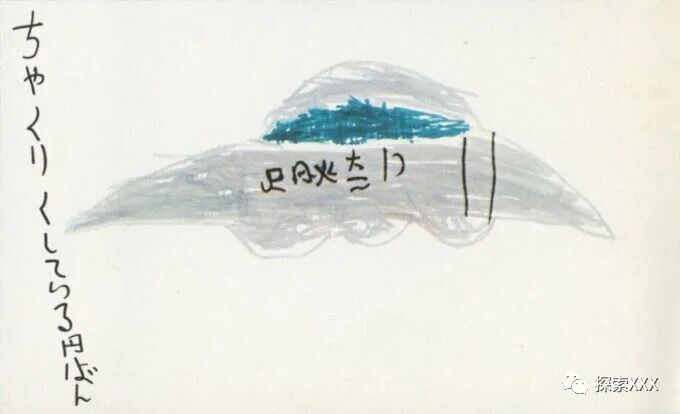 目击者绘制的飞碟的样子,左侧日文意思是“着陆时的碟子”