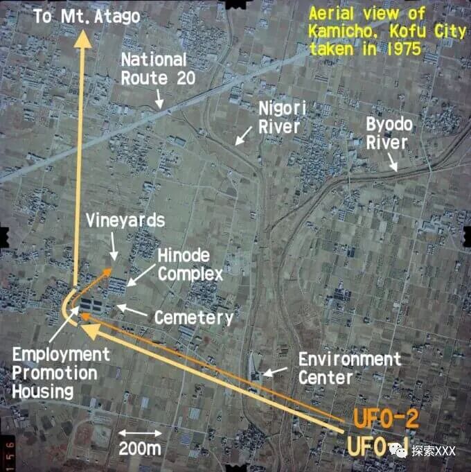 UFO的飞行路线图,使用的是1975年甲府市的航拍照片