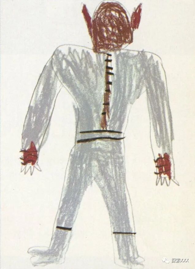 此外,这个外星人有四指的手,穿着两趾分开的鞋子,耳朵又长又大,像兔子的耳朵,但中间有一个洞。外星人的手是棕色的,表面有很深的波浪状皱纹,与脸上的皱纹相似,看起来像手套。