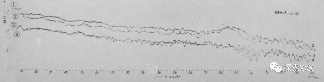 从 UFO 着陆点收集的土壤样本的放射性衰变曲线。(1)和(2)是1975年4月5日,即事件发生后41天,在UFO着陆点采集的土壤样本的放射性测量数据图。(3)和(4)是在事件发生97天后的1975年5月31日采集的样本数据图。(2)和(4)是背景放射性的图,(1)和(3)是检测到的人工放射性的图。