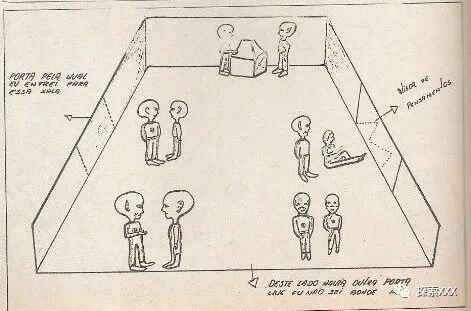 此时的保罗仍然怀疑自己是否正在经历一个真实的事件。他想站起来,并用自己的双手去触摸身边的小矮人,只有这样才能更好地说服自己。然而,他却无法站立。他发现这个房间高度约为1.2米,而保罗的身高为1.74 米。于是,他被迫跪在地上。当他试图把手放在外星人身上时,这个动作也被阻止了。因为突然间,他发现自己又动弹不得了。与此同时,他的脑海中闪过这样的信息:“我们不会对你做什么。所以,也不要试图对我们做任何事!”