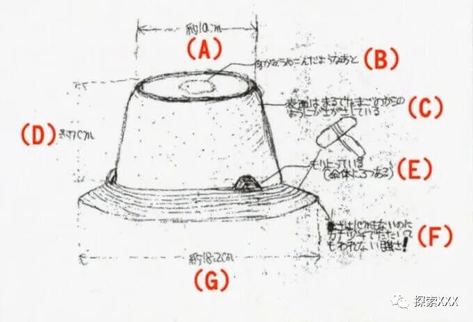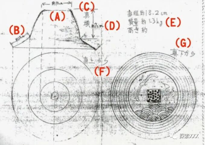 尾岛圭测量了该物体的重量和尺寸,并绘制了草图。据测量,该物体重1.3至1.5公斤,高约7厘米,下部边缘直径约18.2厘米,顶部直径约10厘米。