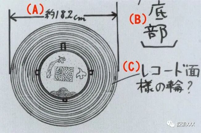 不明飞行物的底面浮雕有波浪和鸻的奇怪图案。底面的周边,有类似旧留声机唱片的圆形凹槽。底边中央还有一个看起来像是方形盖子的东西,盖子上有很多孔。