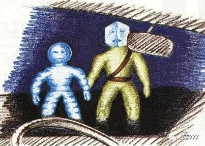 第二个生物戴着一个立方体形状的头盔,前面是透明的,露出了一张奇怪的脸。这里提一句,它们两个的脸是完全相同的,像双胞胎。在第二个生物的头盔下巴处,还有一个黑色的矩形“盒子”。从头盔底部开始,每侧都有一排按钮(至少目击者认为是这样)向下延伸。