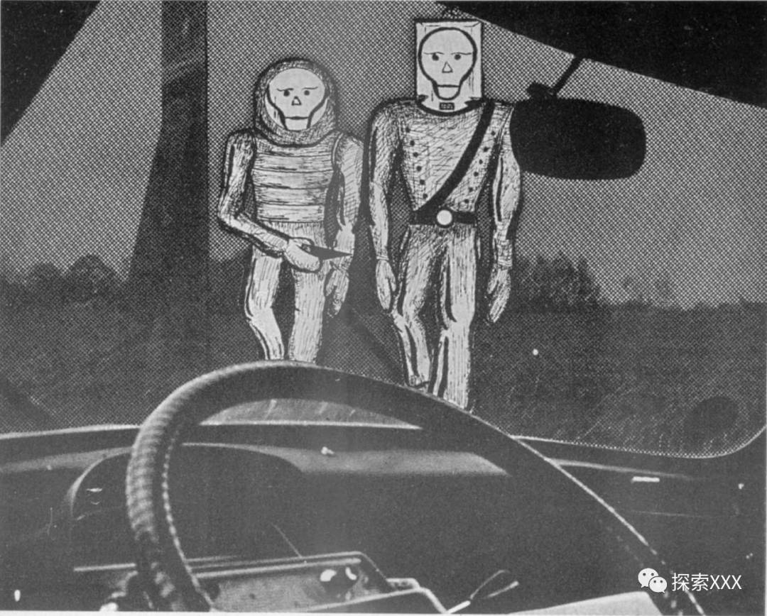透过挡风玻璃,“X”先生还看到两个距离他车子大约30米远的人站在田野里。起初他认为那是一个农民和他的儿子。但很快他意识到这两个绝对不是农民,甚至可以说不是人类。