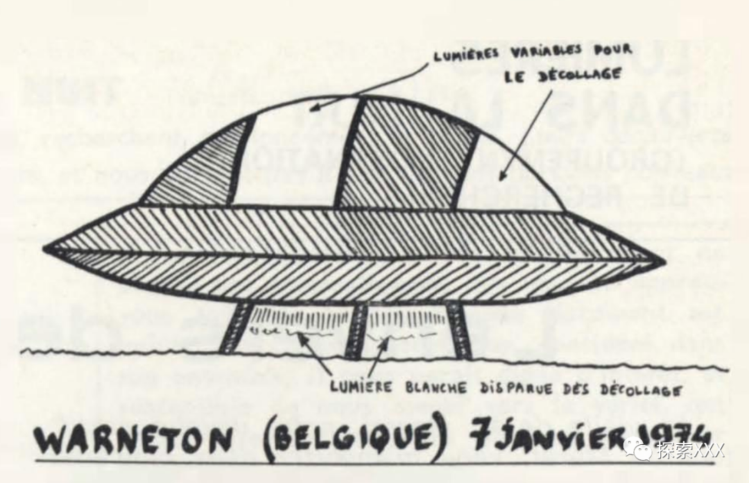“X”先生特别提到,就在机器要起飞刚刚收回三脚架腿时,他通过后视镜看到了一辆汽车从后面驶来的灯光。此时的“X”先生有一种完全解脱了的感觉,他瘫倒在方向盘上。与此同时,他看到的那辆驶来的汽车距离他越来越近,最后停在他的汽车前面。驾驶员(比利时人)下车后走到“X”先生的车旁,发现他瘫坐在方向盘前,手紧紧地握着车门把手。