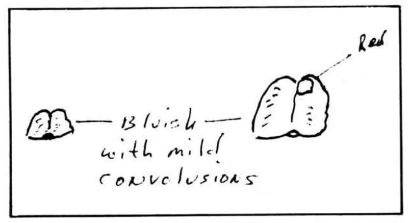 罗德里格斯并没有将其形容为“大脑”,他说那个东西的形状不是完全圆的,边缘有点不规则,像被放气了一样。它大约有篮球大小,有一种顶部和某种线条的花纹。在物体的右上角有一处亮红色。