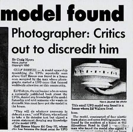 1990年6月10日发表在《彭萨科拉新闻杂志》上的一篇文章更具批判性和争议性。文章中表示,在沃尔特斯夫妇曾经的房子中,发现了一个UFO模型。而发现的时间正好是在所谓的UFO造访期间。文章开篇这样说道:“一个与在微风湾上空出现的UFO很相似的航天器模型,实际上已经在一所房子里发现了。这个人曾住过这所房子,而他的照片引发了UFO热潮,并将全球的注意力集中在这个社区。”