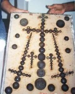 不仅单块的石头上会有奇怪的“艺术创作”,有时还会有整套的石头一起出现。比如,在一起出现的200多块石头中,有一组看起来像“纹章盾牌”的石头,总共由104块组成。其中一些石块的直径很小,只有几厘米。它们一起形成了十字架和剑的图画。