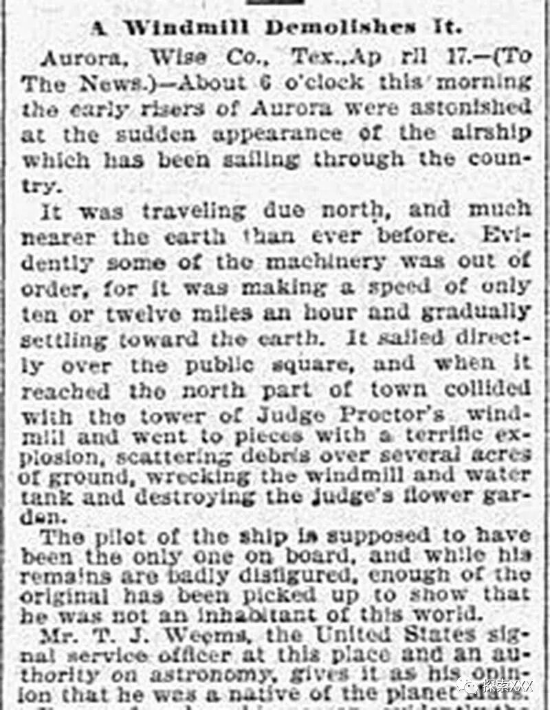 根据其上的一则新闻报道,在4月15日黎明时分,一架奇怪的飞行器坠落到德克萨斯州奥罗拉镇。报道写道: