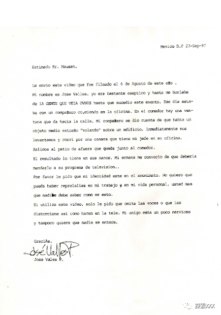 在1997年9月26日收到那盘神秘的VHS录像带时,附有一封打印信件。这封信从未向外界公开,包括其末尾的手写化名签名。幸运的是《第三个千年》节目组将这封信保存了下来。