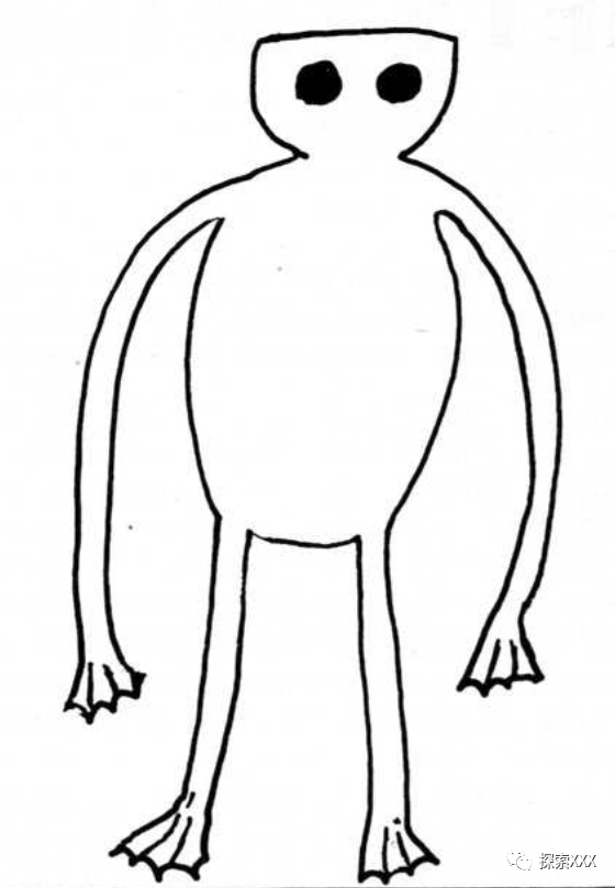 这些生物是绿色和类似青蛙的(请参见图2),直立站立并且完全静止。有些面对着他,有些则只看到了侧面。它们体型有点胖,身高约为1.15米。似乎没有穿衣服,或者穿着一件紧贴身体的连体衣。它们的手臂很长,垂到了它们腿的一半,并有蹼状手。它们的腿看起来很正常,但脚也像青蛙的脚一样有蹼。它们的头似乎被面具或头盔覆盖着,有两个直径约10厘米且类似公路交通信号灯的大红眼睛,但没有发出任何光。