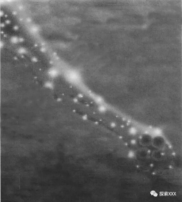 他只近距离遇到了其中的三只,但他在远处看到了大约十来只。第一只是突然出现在他的视野中的。那个生物有一个奇怪的朦胧的外形,实际上可以说是一个几乎透明的物体,感觉很柔软,“看起来像凝胶状”,布满了闪闪发光的小光点或磷光“星”。勒·布雷顿说,它的头部“朝上呈圆形或椭圆形”,尾部上部有一个突起。本来应该有眼睛的地方似乎有两个发光的小开口,像一个颠倒的 “V” 字,发出淡黄色的光。