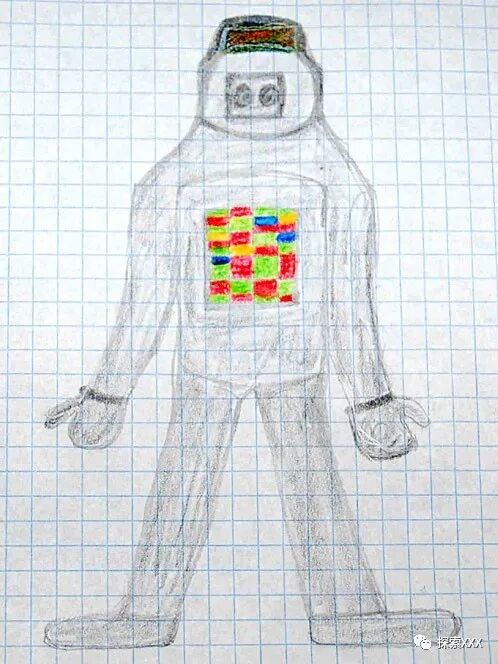 它们的头上戴着带有一种前额带的“头盔”,中间有一个光源,头盔顶部有一些查辛斯基认为是通讯设备的东西。它们的衣服上没有任何标志,但是在它们的胸前有“彩色闪烁的矩形板”,每行有“7个灯”,每个灯都是不同的颜色。查辛斯基记不清那些灯的颜色组合,但他说这些灯“一个接一个地下落,像喷泉一样”。它们还背着看起来像宇航员经常背的包。