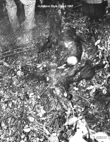 第二张照片显示,尸体后面似乎站着三个人。这些人的腿绝对是军人的,因为他的迷彩服罩在野战靴上面。其他人似乎都穿着雨衣。如果其中一人是军官,则他穿着低矮的下装和“A”级制服(绿色)。据空军称,裤侧有黑色条纹的“A”级制服直到1957年才开始使用。同时这种制服只在冬季穿着。