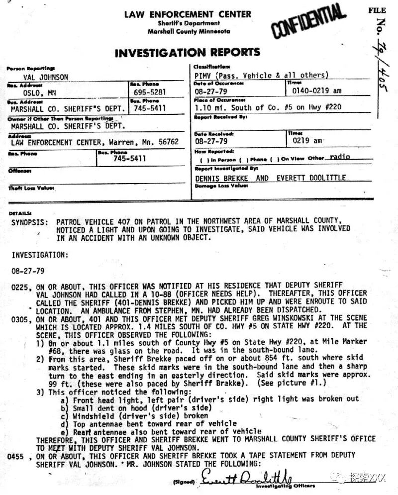 根据海尼克博士的分类标准,瓦尔·约翰逊的UFO事件属于第二类遭遇,因为不明物体留下了物证:那辆遭受撞击的警车。现在,这辆车已被保存并陈列在明尼苏达州沃伦的马歇尔县历史协会博物馆中。事发时,这辆1977款福特LTD警车累计行驶里程为80000英里。根据报纸的报道,在1979年11月,也就是事件发生几个月后它就被放入了博物馆。
