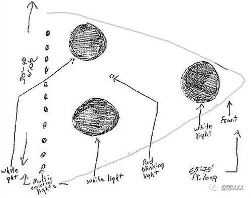 史蒂文斯说这个飞行器形状像一个“胖箭头,大约18-20英尺厚,在后方有三个白色灯光,在底部有一个红灯。