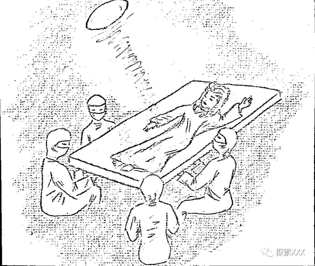 她说,她正在穿过一条隧道,房间里灯火通明。她看到一张方桌,上面坐着一个无助的女人,周围都是身穿白衣的小人影。这些小生物正在仔细地检查这个可怜的女人。用她自己的话说,