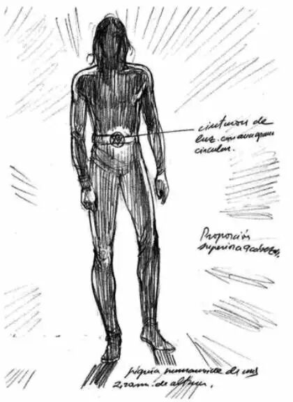 然后士兵们开始射击,但子弹似乎没有对这个“人”造成任何伤害。在闪光的映照下,约弗雷可以辨认出那个“人”穿了件紧身的衣服,还系了一条带有倒三角标志的腰带。