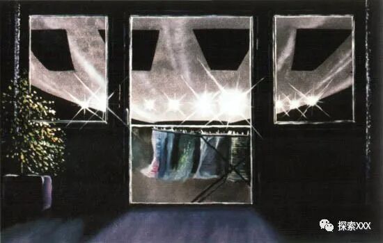 黑色的窗户让我非常害怕,我感觉自己被监视着。不过窗户缓慢地转动着。这个物体以两个方向旋转,上半部分朝一个方向,下半部分朝另一个方向。下半部分有侧面的灯光,底部发出至少三个较大的光。我认为这些光和旋转导致了它的漂浮。