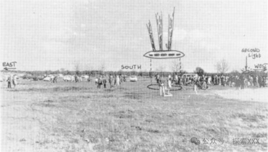 在行驶了大约7分钟后(大约4公里),布鲁尼尔先生来到一条中间拦着铁链的道路上。铁链在车子前方四五米处,不知为何,这条绷紧的铁链断掉了。此时,他车后十米外,那个发光物也消失了。