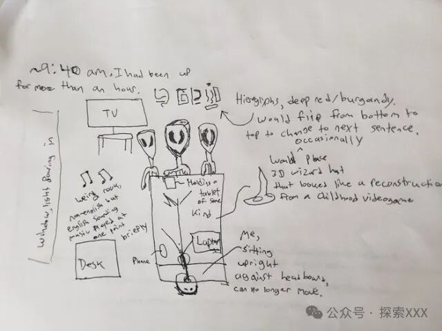 在某个时候,其中一个跳到我身上,缓慢地朝着我的头走去。在我这样做之前,这个生物在离我电视不远的地板上。它的衣服中间显示着这些美丽的金色全息图。当它跳跃时,这些全息图也跳动了。看到这一幕,我立刻想到:“这是该死的玩笑吗?我怎么了?这些是什么东西?”因为我向你保证,它们看起来不像你会期望的外星人。这些东西本质上看起来是空灵的。很难描述。