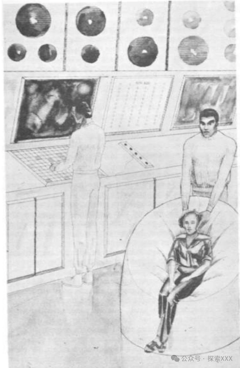 在这个房间里,有三个人,其中两个正在操作一个大型的设备,一个人站在另一台设备旁边,那个人就是卡兰。他站在那里,双臂交叉,看着这对夫妇。随后他们再次戴上头盔,又开始了对话。