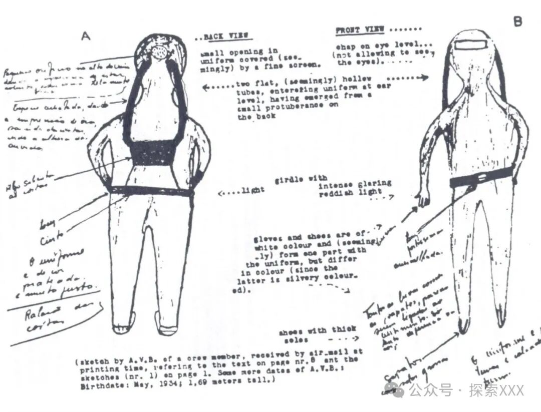 直到那一刻,安东尼奥还不知道绑架他的外星人长什么样。因为五个生物穿着非常贴身的连身裤,用厚厚的灰色布料制成,非常柔软,有些地方还粘着黑色的带子,但全身没有口袋或纽扣。连衣裤的袖子又窄又长,裤子又长又紧,一直延伸到一种靴子里。它们的手也戴着同样颜色的厚厚的五指手套。它们的鞋子看上去与我们的非常不同,鞋底有四到三英寸厚,鞋子的末端稍微向上弯曲。