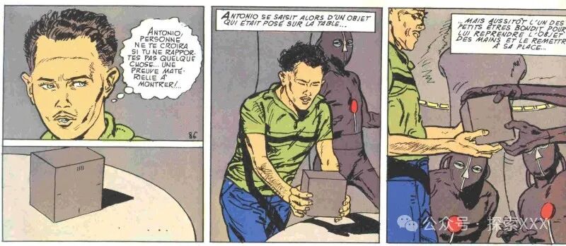 然而,外星人没有安东尼奥时间更仔细地观察该物体,因为其中一个生物以闪电般的速度将安东尼奥推到了一边,从他手中夺走了盒子,并粗暴地把它放回了原处。安东尼奥被外星人的举动吓坏了,他退到最近的墙边,一动不动地站着。