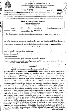 当时警方的尸检报告是由验尸官乔治·佩雷拉·德·奥利维拉和克劳迪奥·罗伯托·扎贝乌签署,他们得出的结论是“死亡原因”是急性出血和多处创伤。此外报告还描述了由于迷走神经刺激而导致“死亡”的因素。