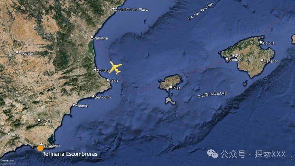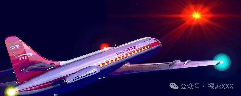 三分钟后,即晚上11点05分,飞行员向控制塔报告,在距他们的位置10点钟方向处出现了强烈的红光。此时,飞机位于伊维萨岛以南18公里处。