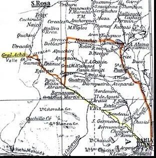 他还提到事件发生在“格林尼治西经68度和南纬37度”,距离布兰卡港有280公里,并且阿查将军镇位于“距此地约200公里”。根据这些数据,它们完全无法协调。这些坐标远离任何道路,位于省西部,距离所提到的城镇有很远的距离(直线距离超过500公里)。根据当时的地图,布兰卡港和阿查将军镇之间的距离大约是264公里。
