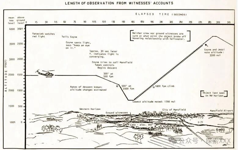 物体在那里悬停了漫长的几秒钟厚,向西北方向飞走。直升机上几人都看到物体尾部有亮白光。科因此刻瞥了一眼高度计,发现他们在3500英尺。科因说集体控制杆此刻仍然完全向下,他无法解释飞机的上升。他所做的操作本应该使直升机迅速下降。科因然后向上拉集体控制杆(这与他应该做的停止上升相反,但集体控制杆已在最低位置,因此他无法再向下推),在3800英尺时,他们感觉到一阵震动,上升停止。随着上升停止,科因再次控制住了飞机,并开始下降回到巡航高度。
