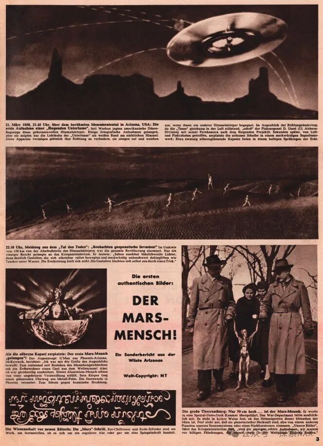 根据这页杂志上的文字,我们知道“击落”飞碟的中士姓“索凯特”(意为“傻瓜”),而UFO研究者一再提到的麦肯尼里奇在原始来源中其实是麦克雷尼奇。这一页还有一张据称是火星文字的图片,而正是这张照片,揭穿了整个故事:如果把那段文字倒置放在镜子前,就可以读到“Die Erde gefällt uns nicht! Wie möchten wieder nach Hause!”,意思是:“我们不喜欢地球!我们想回家!”