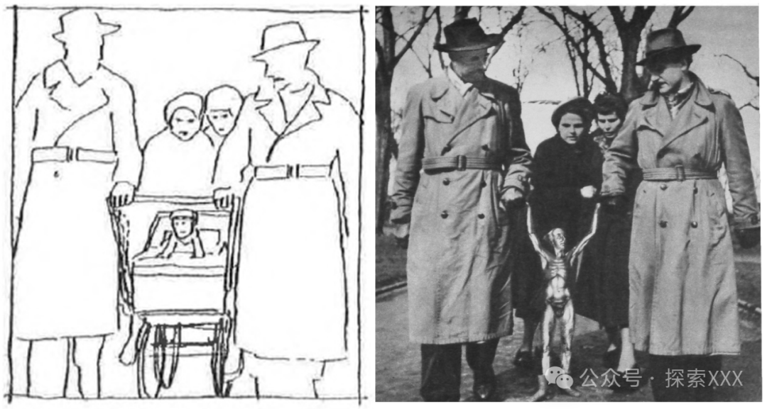 据我所知,这张照片的起源是一个蒙太奇,其中最初出现在照片中的两个男人手扶着一辆(婴儿)车。
