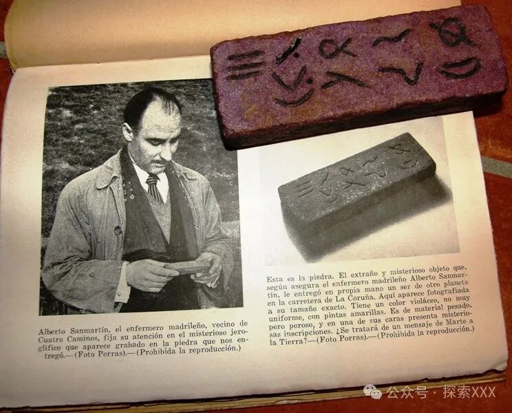 在回到住处的膳宿处,阿尔贝托·桑马丁仔细检查了那天早上他收到的这个奇怪的“礼物”。在房间昏暗的灯光下,他确认这是一块长方形的石头,长十二厘米,宽四厘米,呈紫罗兰色,很轻,表面刻有九个神秘的符号。媒体称其为火星石,因为当时人们普遍相信飞碟的船员来自火星。