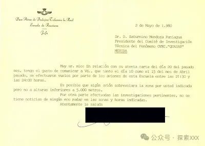 调查人员联系塔拉韦拉拉雷亚尔空军基地,寻求确认事发当晚该地区是否有物体飞过。他们致电了国家航空航天技术研究所 (INTA),但该研究所拒绝听取此事,而是将他们转交给军事当局。军事当局的答复如下: