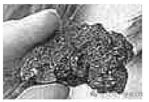 第三份样本是不透明的棕色固体。分析结果表明,这份样品中含有33%的铁,14%的铝,11.43%的碳和41.57%的其他杂质。其中铁以菱铁矿的形式存在,自由碳以石墨形式存在。