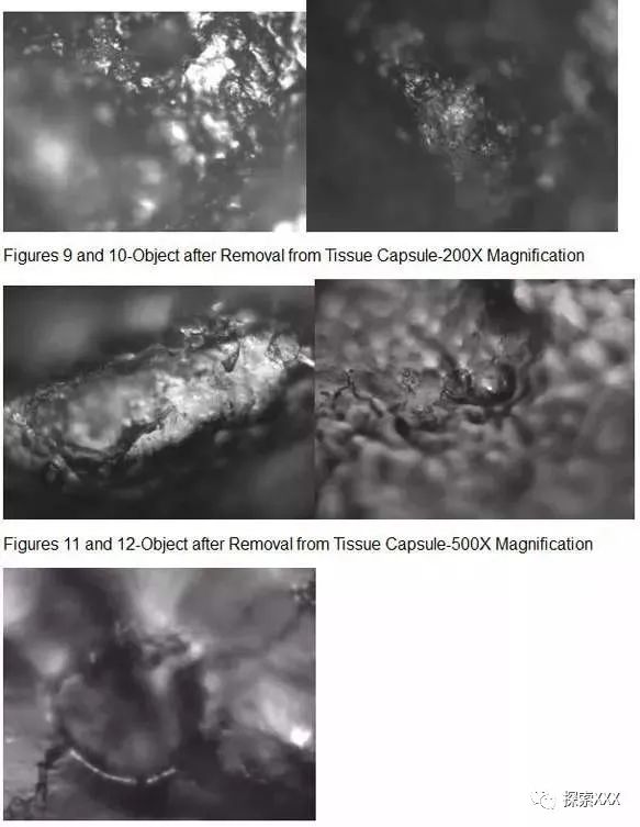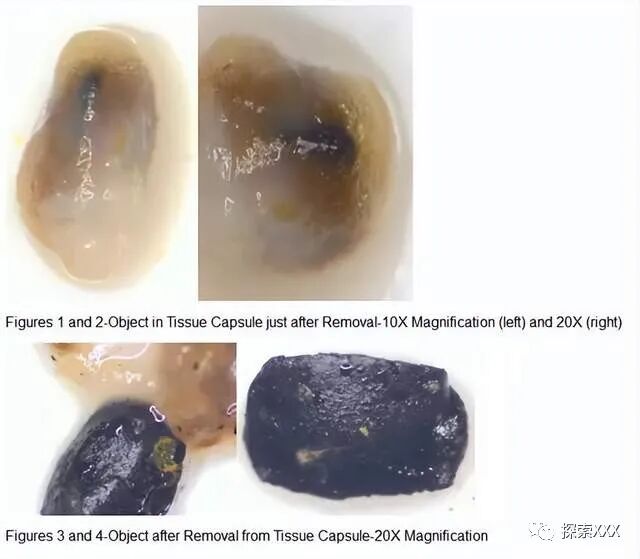 第一次手术的结果是取出了三个物体,两个来自女性患者的脚趾,一个来自男性患者的手。当它们被取出时,所有的物体都覆盖着深灰色的闪亮膜。与期望不同,所有打开这层膜的尝试都令人惊讶地失败了。取出物虽然很像普通的生物组织,但手术刀无法切割。在X光下,这三个物体似乎是金属的。