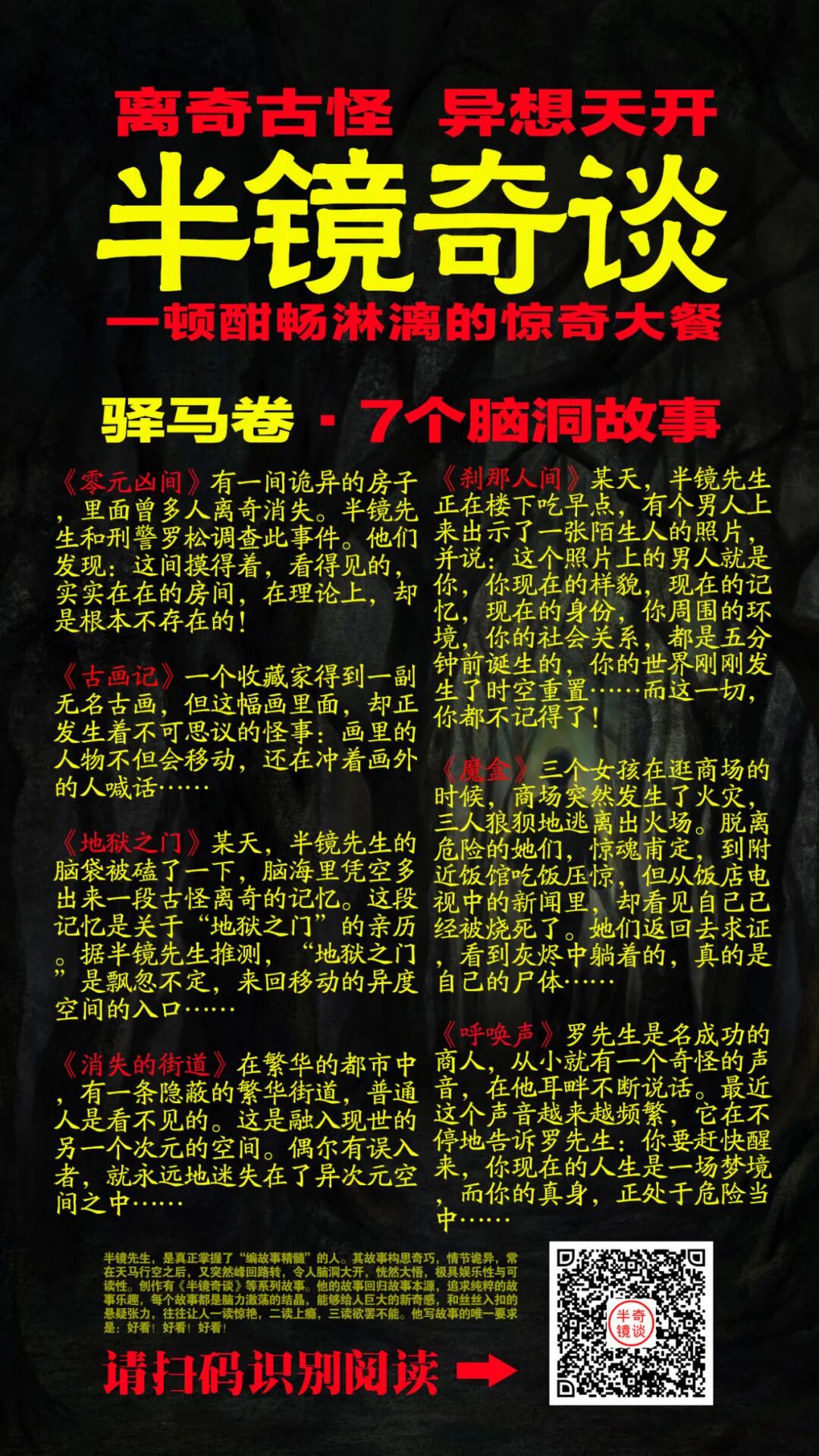 半镜先生,卖故事的人,脑洞故事制造机。其故事构思奇巧,情节诡异,常在天马行空后,又突然峰回路转,令人脑洞大开,三观颠覆,极具娱乐性与可读性。创作有《半镜奇谈》等系列故事,首发于“半镜奇谈”公众号。